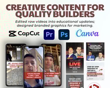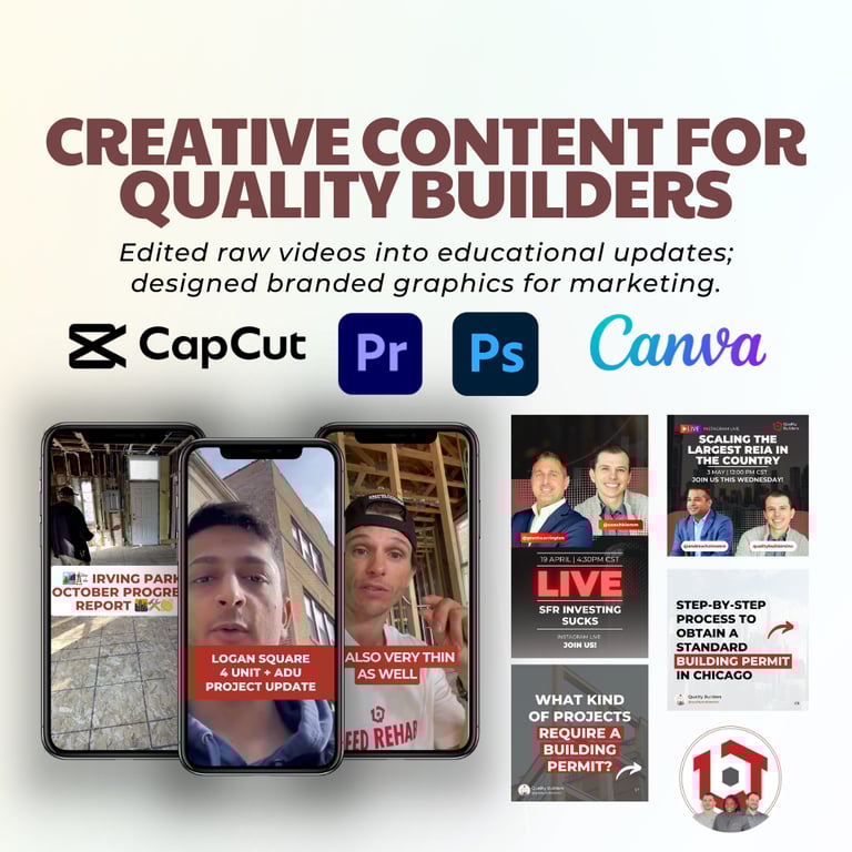 Worked part-time with Quality Builders, a construction company serving the real estate industry, to enhance their marketing presence. Focused on producing visuals that showcased their projects in a professional and compelling way, supporting both client acquisition and ongoing brand visibility.
