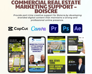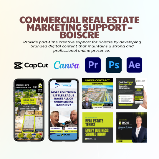 Provide part-time creative support for Boiscre, a commercial real estate company, by developing branded digital content that maintains a strong and professional online presence. The goal is to highlight both property listings and the company’s expertise in the CRE space.