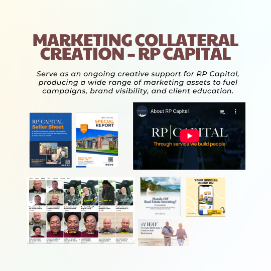 Serve as an ongoing creative support for RP Capital, producing a wide range of marketing assets to fuel campaigns, brand visibility, and client education. These materials are designed to engage audiences across multiple channels and ensure consistent, professional branding.