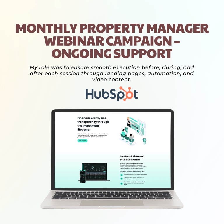 Provided ongoing support for a monthly webinar series led by the Director of Investor Relations. These webinars, designed for property managers (PMs), aimed to educate and strengthen partnerships while building brand authority. My role was to ensure smooth execution before, during, and after each session through landing pages, automation, and video content.
