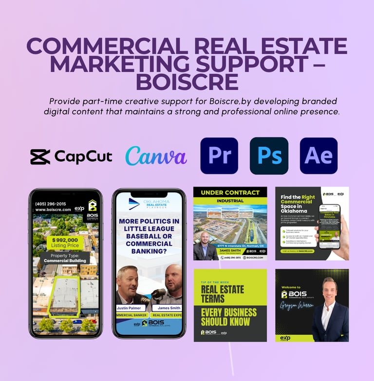 Provided ongoing creative and marketing support for Boiscre, a commercial real estate agent, focused on strengthening online presence and showcasing property listings more effectively.